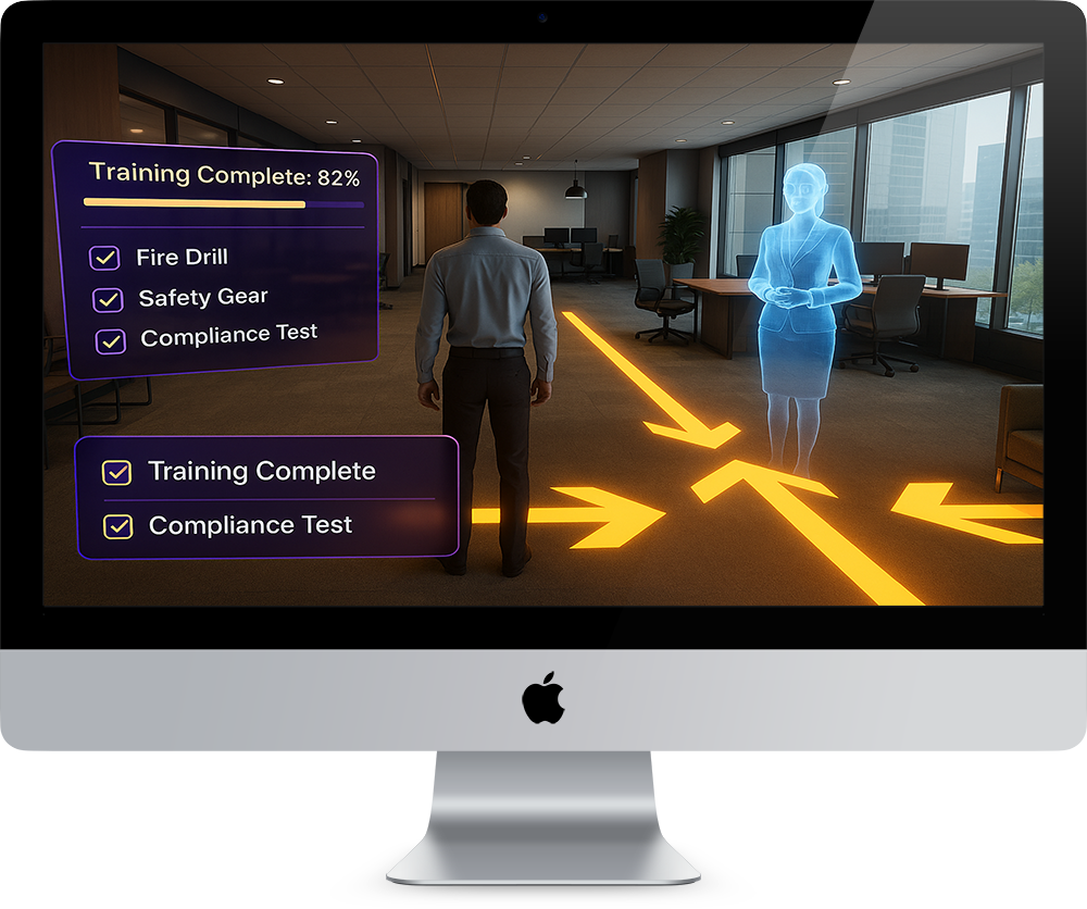 An immersive 3D environment for onboarding, training, and compliance education. Staff learn through interactive, self-paced scenarios with holographic guides, real-time feedback, and trackable progress metrics.