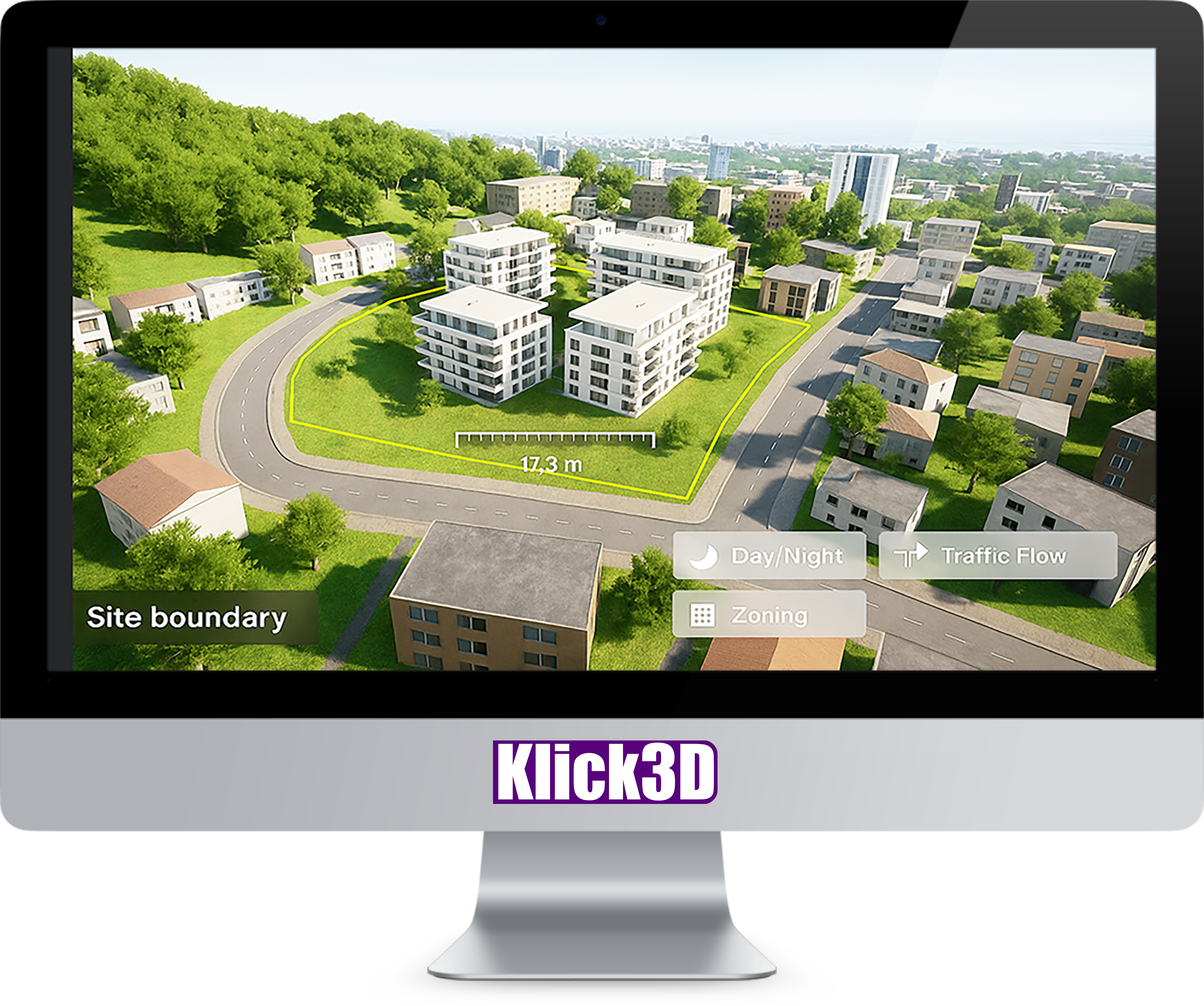 With Klick3D Planning Visualiser, you can place your concept directly into its real-world environment — street, skyline, or countryside — all in 3D.